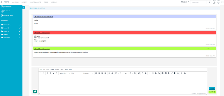Tickets cliente: reclamaciones, sugerencias/Tickets Internos/No conformidades/Creación tickets automáticamente por mail/Asignación de tickets/SLA/Alertas en función tiempo respuesta.